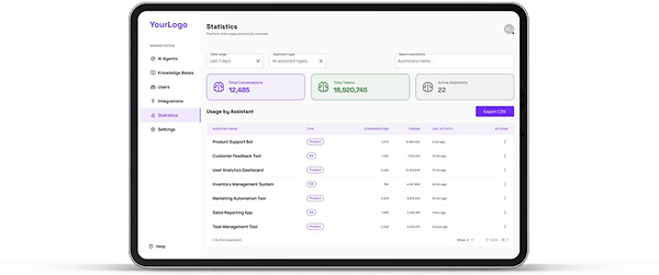 The business client portal allows companies to independently configure their own assistants, manage content, analyze interactions, integrate data sources, and run communication activities through a simple and intuitive interface.